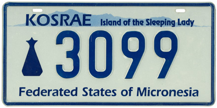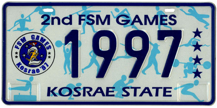 Current series valid since 1988 has a 4 digit embossed blue serial number on the 'Island of the Sleeping Lady' graphic base. Official Government plates have the legend 'KOSRAE STATE' at the top and 'GOVERNMENT VEHICLE' at the bottom. There are other plate types observed, including a legislature vehicle and the Governor plate. In 1997, Kosrae hosted the second FSM Games. A commemorate souvenir license plates with the serial number '1997' were distributed during the festivities. |