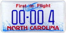 FIRST YEAR OF ISSUE: 1985 (RESUMED IN 2009) PLATE TYPE: GENERAL ISSUE BASE MATERIAL: ALUMINUM REFLECTORIZATION: PARTIAL - BACKGROUND ONLY VALIDATION: 2 DECALS ON REAR PLATE NOTES: BLUE SERIAL ON FIRST IN FLIGHT GRAPHIC BASE