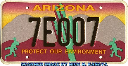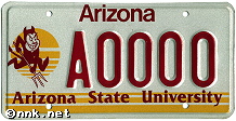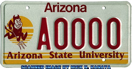 FIRST YEAR OF ISSUE: 1989 PLATE TYPE: COLLEGIATE ISSUE BASE MATERIAL: ALUMINUM REFLECTORIZATION: PARTIAL - BACKGROUND ONLY VALIDATION: 2 DECALS ON THE PLATE NOTES: ARIZONA STATE UNIVERSITY