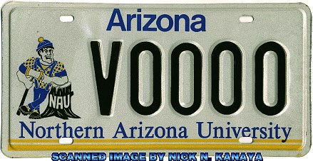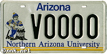 FIRST YEAR OF ISSUE: 1989 PLATE TYPE: COLLEGIATE ISSUE BASE MATERIAL: STEEL REFLECTORIZATION: PARTIAL - BACKGROUND ONLY VALIDATION: 2 DECALS ON THE PLATE NOTES: NORTHERN ARIZONA UNIVERSITY