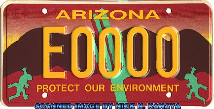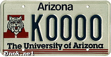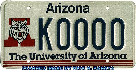 FIRST YEAR OF ISSUE: 1989 PLATE TYPE: COLLEGIATE ISSUE BASE MATERIAL: ALUMINUM REFLECTORIZATION: PARTIAL - BACKGROUND ONLY VALIDATION: 2 DECALS ON THE PLATE NOTES: THE UNIVERSITY OF ARIZONA