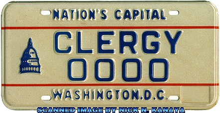 REFERENCE NUMBER: DC-1979ND-CLEFIRST YEAR OF ISSUE: 1979 PLATE TYPE: OPTIONAL ISSUE BASE MATERIAL: ALUMINUM REFLECTORIZATION: PARTIAL - BACKGROUND ONLY VALIDATION: 2 DECALS ON EACH PLATE NOTES: ISSUED TO MEMBERS OF CLERGY