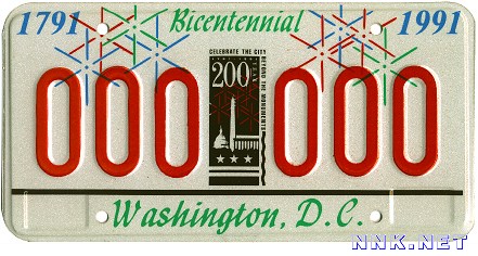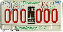 REFERENCE NUMBER: DC-1991-BICFIRST YEAR OF ISSUE: 1991 PLATE TYPE: OPTIONAL ISSUE BASE MATERIAL: ALUMINUM REFLECTORIZATION: PARTIAL - BACKGROUND ONLY VALIDATION: 2 DECALS ON EACH PLATE NOTES: WASHINGTON, D.C. BICENTENNIAL