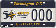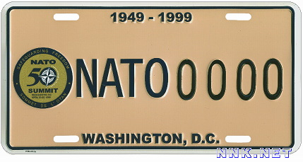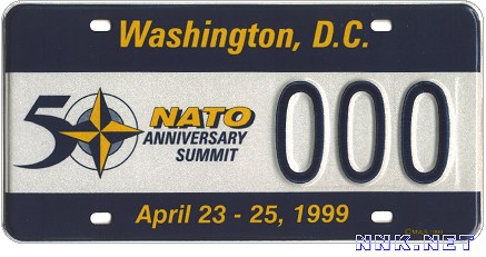 REFERENCE NUMBER: DC-1999-NAT-BFIRST YEAR OF ISSUE: 1999 PLATE TYPE: SPECIAL EVENT BASE MATERIAL: ALUMINUM REFLECTORIZATION: PARTIAL - BACKGROUND ONLY VALIDATION: UNKNOWN NOTES: ISSUED BY NATO HOST COMMITTEE