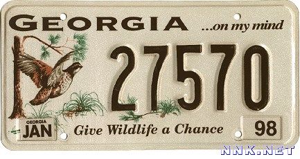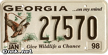 REFERENCE NUMBER: GA-1998-GWCFIRST YEAR OF ISSUE: 1997 PLATE TYPE: OPTIONAL ISSUE BASE MATERIAL: ALUMINUM REFLECTORIZATION: PARTIAL - BACKGROUND ONLY VALIDATION: 2 OR MORE DECALS ON THE PLATE NOTES: WILFLIFE CONSERVATION