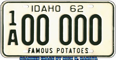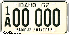 REFERENCE NUMBER: ID-1962FIRST YEAR OF ISSUE: 1962 PLATE TYPE: GENERAL ISSUE BASE MATERIAL: STEEL REFLECTORIZATION: NON-REFLECTIVE VALIDATION: NO DECALS USED ON PLATE NOTES: GREEN SERIAL ON WHITE BASE