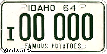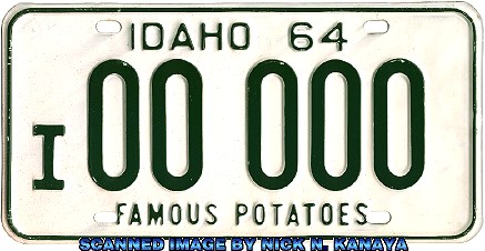 REFERENCE NUMBER: ID-1964FIRST YEAR OF ISSUE: 1964 PLATE TYPE: GENERAL ISSUE BASE MATERIAL: STEEL REFLECTORIZATION: NON-REFLECTIVE VALIDATION: NO DECALS USED ON PLATE NOTES: GREEN SERIAL ON WHITE BASE