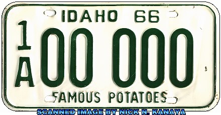 REFERENCE NUMBER: ID-1966FIRST YEAR OF ISSUE: 1966 PLATE TYPE: GENERAL ISSUE BASE MATERIAL: STEEL REFLECTORIZATION: NON-REFLECTIVE VALIDATION: NO DECALS USED ON PLATE NOTES: GREEN SERIAL ON WHITE BASE