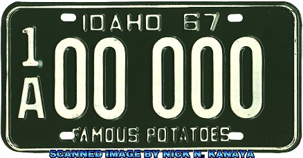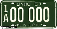 REFERENCE NUMBER: ID-1967FIRST YEAR OF ISSUE: 1967 PLATE TYPE: GENERAL ISSUE BASE MATERIAL: STEEL REFLECTORIZATION: NON-REFLECTIVE VALIDATION: NO DECALS USED ON PLATE NOTES: WHITE SERIAL ON GREEN BASE
