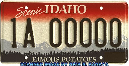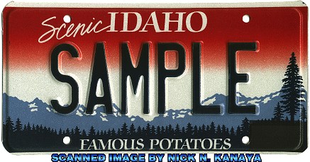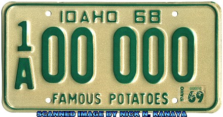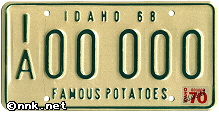 REFERENCE NUMBER: ID-1968-AFIRST YEAR OF ISSUE: 1968 PLATE TYPE: GENERAL ISSUE BASE MATERIAL: ALUMINUM REFLECTORIZATION: FULLY REFLECTIVE VALIDATION: 1 OR MORE DECALS ON EACH PLATE (1969-) NOTES: OLDER (SAME AS 1967) DIE VARIETY
