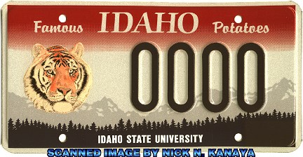 REFERENCE NUMBER: ID-1998ND-ISUFIRST YEAR OF ISSUE: 1998 PLATE TYPE: COLLEGIATE ISSUE BASE MATERIAL: ALUMINUM REFLECTORIZATION: PARTIAL - BACKGROUND ONLY VALIDATION: 1 DECAL ON EACH PLATE NOTES: IDAHO STATE UNIVERSITY