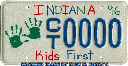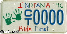 REFERENCE NUMBER: IN-1996-KIDFIRST YEAR OF ISSUE: 1996 PLATE TYPE: OPTIONAL ISSUE BASE MATERIAL: ALUMINUM REFLECTORIZATION: PARTIAL - BACKGROUND ONLY VALIDATION: 2 DECALS ON REAR PLATE NOTES: The stacked letters are not constant