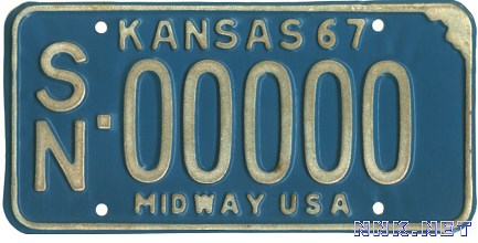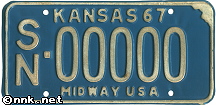 REFERENCE NUMBER: KS-1967FIRST YEAR OF ISSUE: 1966 PLATE TYPE: GENERAL ISSUE BASE MATERIAL: STEEL REFLECTORIZATION: PARTIAL - SERIAL ONLY VALIDATION: NO DECALS USED ON PLATE NOTES: REFLECTIVE WHITE SERIAL ON PALE BLUE BASE