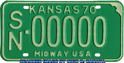REFERENCE NUMBER: KS-1970FIRST YEAR OF ISSUE: 1969 PLATE TYPE: GENERAL ISSUE BASE MATERIAL: STEEL REFLECTORIZATION: PARTIAL - SERIAL ONLY VALIDATION: NO DECALS USED ON PLATE NOTES: REFLECTIVE WHITE SERIAL ON PALE GREEN BASE