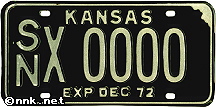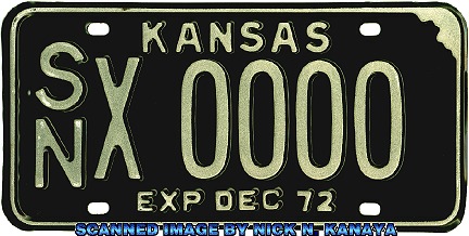 REFERENCE NUMBER: KS-1972FIRST YEAR OF ISSUE: 1971 PLATE TYPE: GENERAL ISSUE BASE MATERIAL: STEEL REFLECTORIZATION: PARTIAL - SERIAL ONLY VALIDATION: NO DECALS USED ON PLATE NOTES: REFLECTIVE WHITE SERIAL ON BLACK BASE