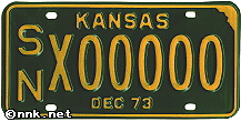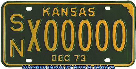 REFERENCE NUMBER: KS-1973FIRST YEAR OF ISSUE: 1972 PLATE TYPE: GENERAL ISSUE BASE MATERIAL: STEEL REFLECTORIZATION: PARTIAL - SERIAL ONLY VALIDATION: NO DECALS USED ON PLATE NOTES: REFLECTIVE YELLOW SERIAL ON DARK GREEN BASE