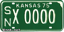 REFERENCE NUMBER: KS-1975-BFIRST YEAR OF ISSUE: 1974 PLATE TYPE: GENERAL ISSUE BASE MATERIAL: ALUMINUM REFLECTORIZATION: NON-REFLECTIVE VALIDATION: NO DECALS USED ON PLATE NOTES: WHITE SERIAL ON GREEN BASE (NO LEGEND BOTTOM)