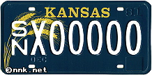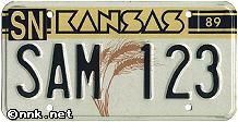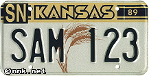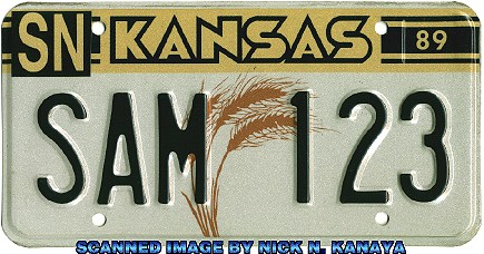 REFERENCE NUMBER: KS-1989-BFIRST YEAR OF ISSUE: 1989 PLATE TYPE: GENERAL ISSUE BASE MATERIAL: ALUMINUM REFLECTORIZATION: PARTIAL - BACKGROUND ONLY VALIDATION: COUNTY, MONTH & YEAR STICKERS ON REAR PLATE NOTES: BLUE SERIAL ON REDESIGNED 'KANSAS' GRAPHIC BASE