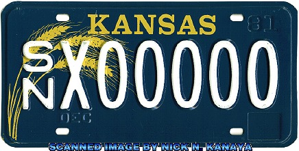 REFERENCE NUMBER: KS-1981FIRST YEAR OF ISSUE: 1980 PLATE TYPE: GENERAL ISSUE BASE MATERIAL: ALUMINUM REFLECTORIZATION: NON-REFLECTIVE VALIDATION: YEAR STICKER ON REAR PLATE NOTES: WHITE SERIAL ON BLUE BASE