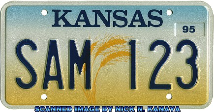 REFERENCE NUMBER: KS-1995FIRST YEAR OF ISSUE: 1994 PLATE TYPE: GENERAL ISSUE BASE MATERIAL: ALUMINUM REFLECTORIZATION: PARTIAL - BACKGROUND ONLY VALIDATION: COUNTY, MONTH & YEAR STICKERS ON REAR PLATE NOTES: BLUE SERIAL ON REFLECTIVE GRAPHIC BASE