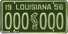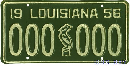 REFERENCE NUMBER: LA-1956FIRST YEAR OF ISSUE: 1956 PLATE TYPE: GENERAL ISSUE BASE MATERIAL: STEEL REFLECTORIZATION: PARTIAL - SERIAL ONLY VALIDATION: NO DECALS USED ON PLATE NOTES: REFLECTIVE WHITE SERIAL ON DARK GREEN BASE