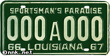 REFERENCE NUMBER: LA-1966FIRST YEAR OF ISSUE: 1966 PLATE TYPE: GENERAL ISSUE BASE MATERIAL: STEEL REFLECTORIZATION: PARTIAL - SERIAL ONLY VALIDATION: NO DECALS USED ON PLATE NOTES: REFLECTIVE WHITE SERIAL ON DARK GREEN BASE