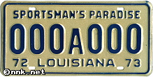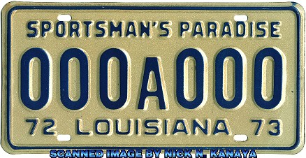 REFERENCE NUMBER: LA-1972FIRST YEAR OF ISSUE: 1972 PLATE TYPE: GENERAL ISSUE BASE MATERIAL: STEEL REFLECTORIZATION: PARTIAL - BACKGROUND ONLY VALIDATION: NO DECALS USED ON PLATE NOTES: BLUE SERIAL ON REFLECTIVE WHITE BASE