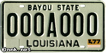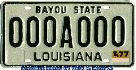 REFERENCE NUMBER: LA-1977NDFIRST YEAR OF ISSUE: 1977 PLATE TYPE: GENERAL ISSUE BASE MATERIAL: ALUMINUM REFLECTORIZATION: PARTIAL - BACKGROUND ONLY VALIDATION: 2 DECALS ON THE PLATE NOTES: BLACK SERIAL ON REFLECTIVE WHITE BASE "BAYOU STATE" AT THE TOP