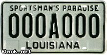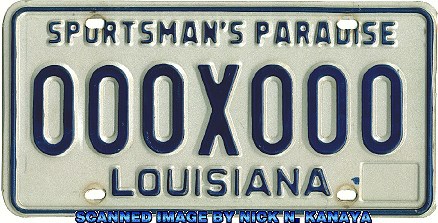 REFERENCE NUMBER: LA-1980NDFIRST YEAR OF ISSUE: 1980 PLATE TYPE: GENERAL ISSUE BASE MATERIAL: ALUMINUM REFLECTORIZATION: PARTIAL - BACKGROUND ONLY VALIDATION: 2 DECALS ON THE PLATE NOTES: BLACK SERIAL ON REFLECTIVE WHITE BASE "SPORTSMAN'S PARADISE" AT THE TOP
