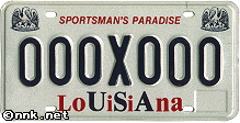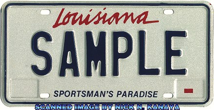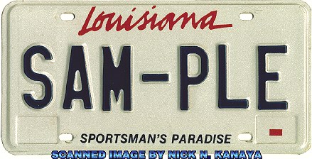 FIRST YEAR OF ISSUE: 2002 PLATE TYPE: GENERAL ISSUE BASE MATERIAL: ALUMINUM REFLECTORIZATION: PARTIAL - BACKGROUND ONLY VALIDATION: MONTH AND YEAR DECAL ON THE PLATE NOTES: DARK BLUE SERIAL ON LOUISIANA PURCHASE GRAPHIC BASE