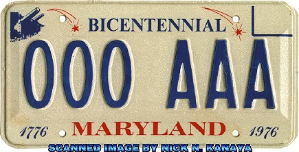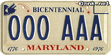 REFERENCE NUMBER: MD-1976-BICFIRST YEAR OF ISSUE: 1976 PLATE TYPE: OPTIONAL ISSUE BASE MATERIAL: ALUMINUM REFLECTORIZATION: PARTIAL - BACKGROUND ONLY VALIDATION: 1 DECAL USED ON EACH PLATE NOTES: Bicentennial 5-year plate for an initial fee of $5.00