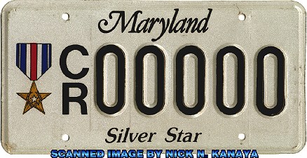 REFERENCE NUMBER: MD-1994ND-SSTFIRST YEAR OF ISSUE: 1994 PLATE TYPE: OPTIONAL ISSUE BASE MATERIAL: STEEL REFLECTORIZATION: PARTIAL - BACKGROUND ONLY VALIDATION: 2 DECALS ON REAR PLATE NOTES: ISSUED TO SILVER STAR RECIPIENTS