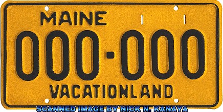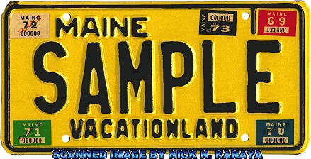REFERENCE NUMBER: ME-1969ND-BFIRST YEAR OF ISSUE: 1969 PLATE TYPE: GENERAL ISSUE BASE MATERIAL: ALUMINUM REFLECTORIZATION: PARTIAL - BACKGROUND ONLY VALIDATION: 1 OR MORE DECALS ON EACH PLATE NOTES: BLACK SERIAL ON REFLECTIVE YELLOW BASE