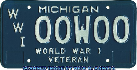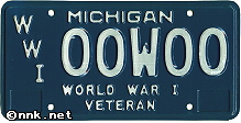 REFERENCE NUMBER: MI-1988ND-VET-WW1FIRST YEAR OF ISSUE: 1988 PLATE TYPE: OPTIONAL ISSUE BASE MATERIAL: ALUMINUM REFLECTORIZATION: PARTIAL - SERIAL ONLY VALIDATION: 2 DECALS ON REAR PLATE NOTES: WORLD WAR I VETERAN