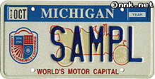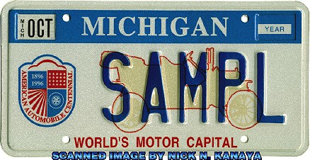 REFERENCE NUMBER: MI-1996-WMCFIRST YEAR OF ISSUE: 1996 PLATE TYPE: OPTIONAL ISSUE BASE MATERIAL: ALUMINUM REFLECTORIZATION: PARTIAL - BACKGROUND ONLY VALIDATION: 2 DECALS ON REAR PLATE NOTES: AMERICAN AUTOMOBILE CENTENNIAL