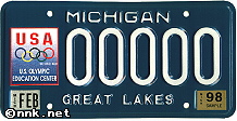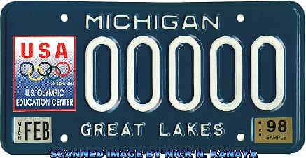REFERENCE NUMBER: MI-1996ND-OECFIRST YEAR OF ISSUE: 1996 PLATE TYPE: OPTIONAL ISSUE BASE MATERIAL: ALUMINUM REFLECTORIZATION: PARTIAL - SERIAL ONLY VALIDATION: 2 DECALS ON REAR PLATE NOTES: U. S. OLYMPIC EDUCATION CENTER