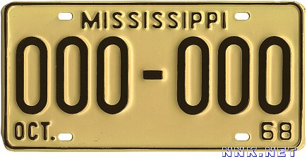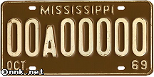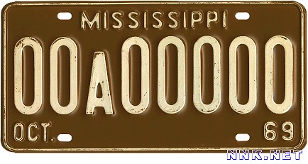 REFERENCE NUMBER: MS-1969FIRST YEAR OF ISSUE: 1968 PLATE TYPE: GENERAL ISSUE BASE MATERIAL: STEEL REFLECTORIZATION: NON-REFLECTIVE VALIDATION: NO DECALS USED ON PLATE NOTES: WHITE SERIAL ON BROWN BASE
