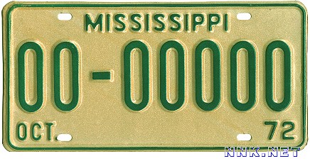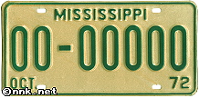 REFERENCE NUMBER: MS-1972FIRST YEAR OF ISSUE: 1971 PLATE TYPE: GENERAL ISSUE BASE MATERIAL: STEEL REFLECTORIZATION: PARTIAL - BACKGROUND ONLY VALIDATION: NO DECALS USED ON PLATE NOTES: GREEN SERIAL ON REFLECTIVE WHITE BASE
