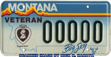 REFERENCE NUMBER: MT-1991ND-PURFIRST YEAR OF ISSUE: 1991 PLATE TYPE: OPTIONAL ISSUE BASE MATERIAL: ALUMINUM REFLECTORIZATION: PARTIAL - BACKGROUND ONLY VALIDATION: 2 DECALS ON EACH PLATE NOTES: ISSUED TO PURPLE HEART RECIPIENTS