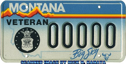 REFERENCE NUMBER: MT-1991ND-VAFFIRST YEAR OF ISSUE: 1991 PLATE TYPE: OPTIONAL ISSUE BASE MATERIAL: ALUMINUM REFLECTORIZATION: PARTIAL - BACKGROUND ONLY VALIDATION: 2 DECALS ON EACH PLATE NOTES: ISSUED TO U. S. AIR FORCE VETERANS