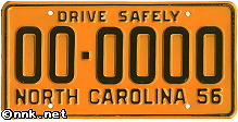 REFERENCE NUMBER: NC-1956FIRST YEAR OF ISSUE: 1955 PLATE TYPE: GENERAL ISSUE BASE MATERIAL: STEEL REFLECTORIZATION: NON-REFLECTIVE VALIDATION: NO DECALS USED ON PLATE NOTES: BLACK SERIAL ON YELLOW-ORANGE BASE