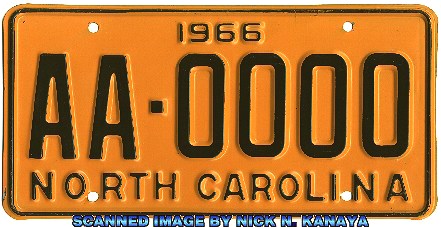 REFERENCE NUMBER: NC-1966FIRST YEAR OF ISSUE: 1965 PLATE TYPE: GENERAL ISSUE BASE MATERIAL: STEEL REFLECTORIZATION: NON-REFLECTIVE VALIDATION: NO DECALS USED ON PLATE NOTES: BLACK SERIAL ON YELLOW-ORANGE BASE
