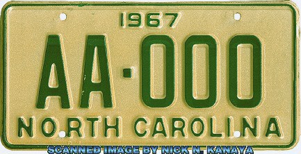 REFERENCE NUMBER: NC-1967FIRST YEAR OF ISSUE: 1966 PLATE TYPE: GENERAL ISSUE BASE MATERIAL: STEEL REFLECTORIZATION: PARTIAL - BACKGROUND ONLY VALIDATION: NO DECALS USED ON PLATE NOTES: GREEN SERIAL ON REFLECTIVE WHITE BASE