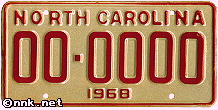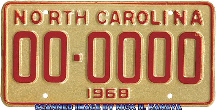 REFERENCE NUMBER: NC-1968FIRST YEAR OF ISSUE: 1967 PLATE TYPE: GENERAL ISSUE BASE MATERIAL: STEEL REFLECTORIZATION: PARTIAL - BACKGROUND ONLY VALIDATION: NO DECALS USED ON PLATE NOTES: RED SERIAL ON REFLECTIVE WHITE BASE
