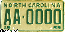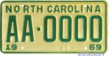 REFERENCE NUMBER: NC-1969FIRST YEAR OF ISSUE: 1968 PLATE TYPE: GENERAL ISSUE BASE MATERIAL: STEEL REFLECTORIZATION: PARTIAL - BACKGROUND ONLY VALIDATION: NO DECALS USED ON PLATE NOTES: GREEN SERIAL ON REFLECTIVE WHITE BASE