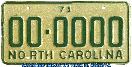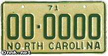 REFERENCE NUMBER: NC-1971FIRST YEAR OF ISSUE: 1970 PLATE TYPE: GENERAL ISSUE BASE MATERIAL: STEEL REFLECTORIZATION: PARTIAL - BACKGROUND ONLY VALIDATION: NO DECALS USED ON PLATE NOTES: GREEN SERIAL ON REFLECTIVE WHITE BASE