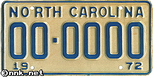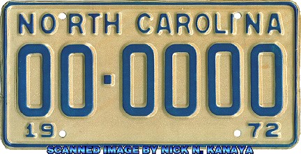 REFERENCE NUMBER: NC-1972FIRST YEAR OF ISSUE: 1971 PLATE TYPE: GENERAL ISSUE BASE MATERIAL: STEEL REFLECTORIZATION: PARTIAL - BACKGROUND ONLY VALIDATION: NO DECALS USED ON PLATE NOTES: BLUE SERIAL ON REFLECTIVE WHITE BASE