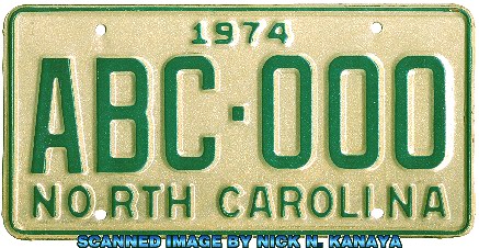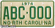 REFERENCE NUMBER: NC-1974FIRST YEAR OF ISSUE: 1973 PLATE TYPE: GENERAL ISSUE BASE MATERIAL: STEEL REFLECTORIZATION: PARTIAL - BACKGROUND ONLY VALIDATION: NO DECALS USED ON PLATE NOTES: GREEN SERIAL ON REFLECTIVE WHITE BASE