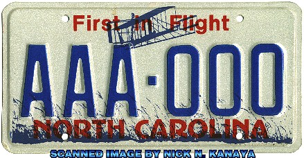 FIRST YEAR OF ISSUE: 1985 (RESUMED IN 2009) PLATE TYPE: GENERAL ISSUE BASE MATERIAL: ALUMINUM REFLECTORIZATION: PARTIAL - BACKGROUND ONLY VALIDATION: 2 DECALS ON REAR PLATE NOTES: BLUE SERIAL ON FIRST IN FLIGHT GRAPHIC BASE