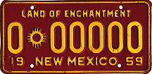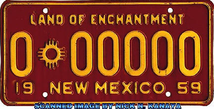 REFERENCE NUMBER: NM-1959FIRST YEAR OF ISSUE: 1958 PLATE TYPE: GENERAL ISSUE BASE MATERIAL: STEEL REFLECTORIZATION: NON-REFLECTIVE VALIDATION: 1 DECAL ON THE PLATE NOTES: YELLOW SERIAL ON DARK RED BASE